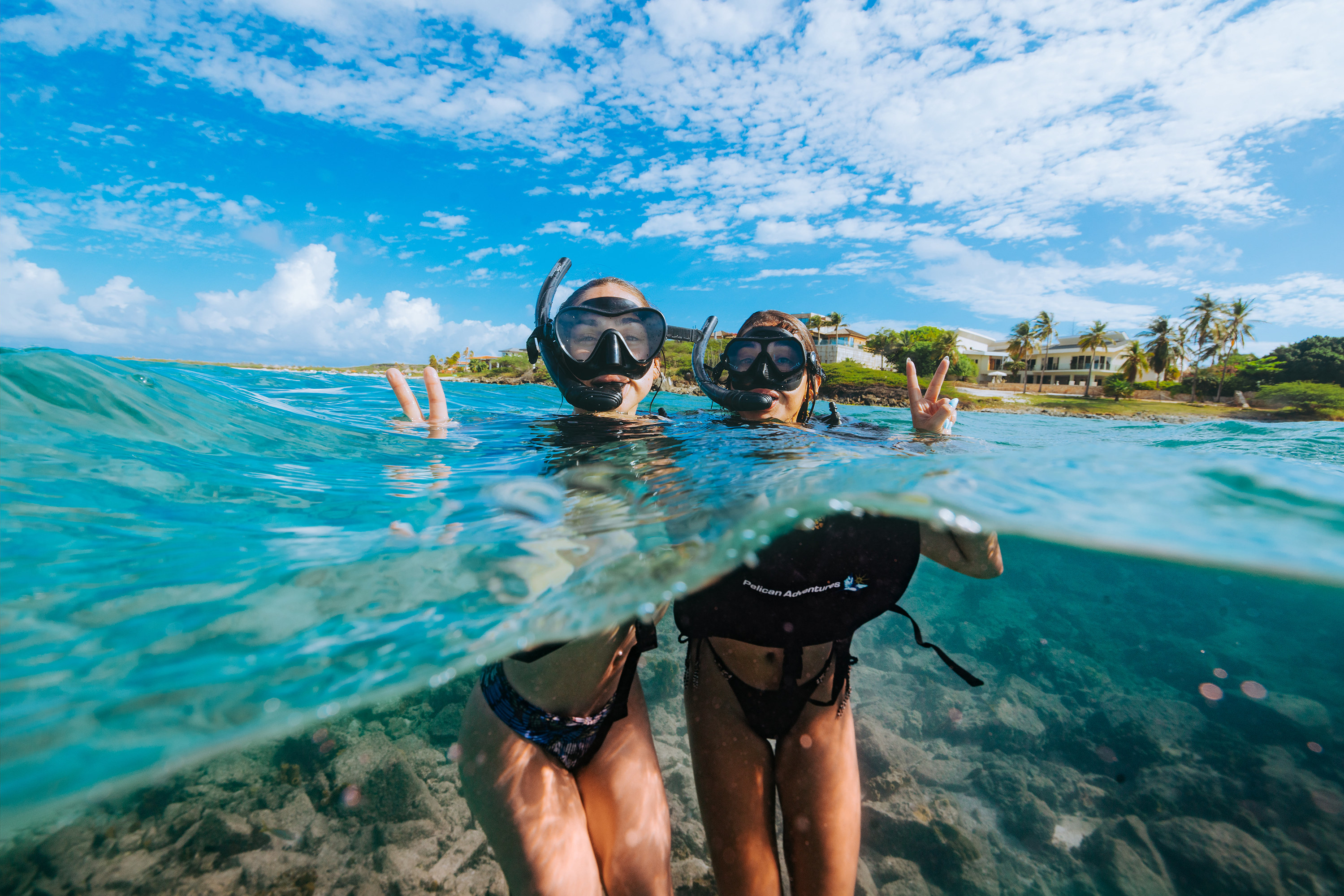 You’ll drift above white sand patches, gentle limestone formations, and protected seagrass beds where turtles feed, surrounded by shimmering schools of parrotfish, butterflyfish, sergeant majors, and blue tangs. Along the way, your guide will point out natural sea caves and tunnels carved into the limestone cliffs, creating a scene of pure island magic.